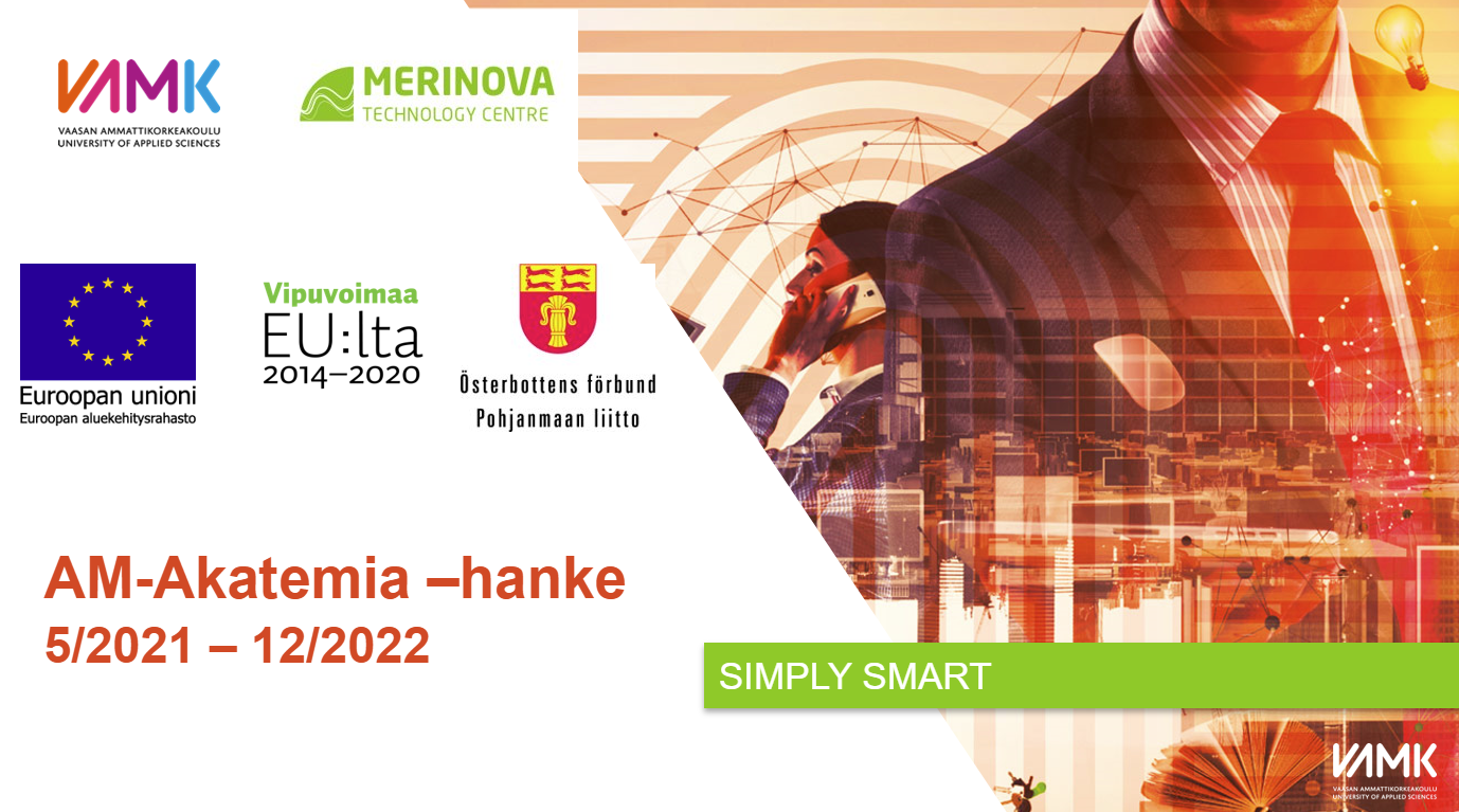 - 9.00-9:20 Lyhyesti AM Akatemia -hankkeen tavoitteista ja siinä toteutettuja & tulostettuja osaideoita / Sami Elomaa, AM Akatemia -hankkeen projektipäällikkö, Vaasan ammattikorkeakoulu