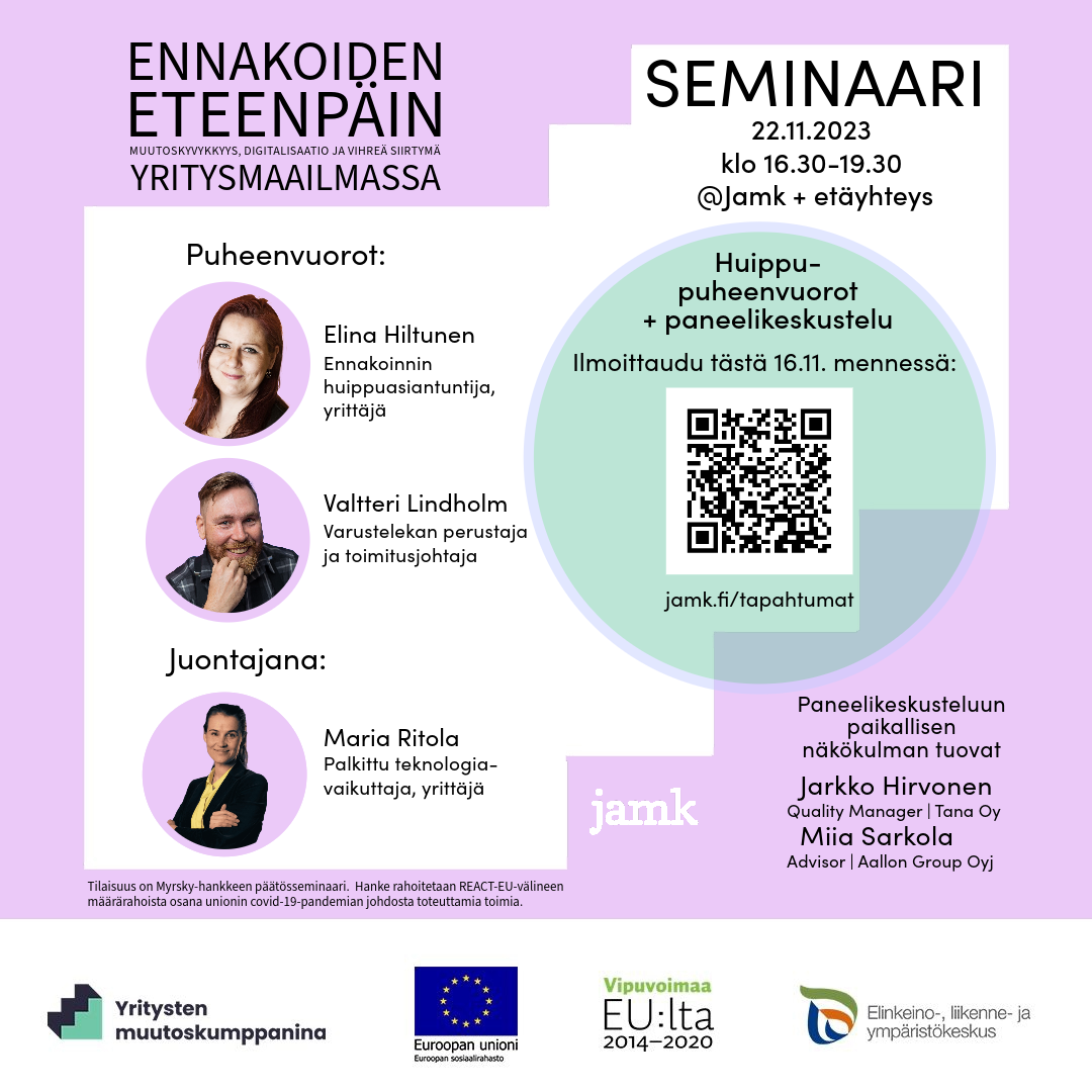 Epävarmoinakin aikoina on paljon mahdollisuuksia vaikuttaa itse liiketoiminnan hallittuun suuntaamiseen, ja tämäkin tilaisuus on vuorattu huippupuhujilla, sillä tilaisuuden puhujakaartiin kuuluvat ennakoinnin huippuasiantuntija, futuristi Elina Hiltunen ja Varustelekan perustaja, yrittäjä Valtteri Lindholm. Paneelikeskustelussa heitä täydentää Tana Oy:n Quality Manager Jarkko Hirvonen tuoden paikallista näkökulmaa. JAMKin edustajana paneelissa toimii liiketoimintayksikön TKI-päällikkö Mirva Leppälä. Seminaarin juontaa teknologiavaikuttaja Maria Ritola.