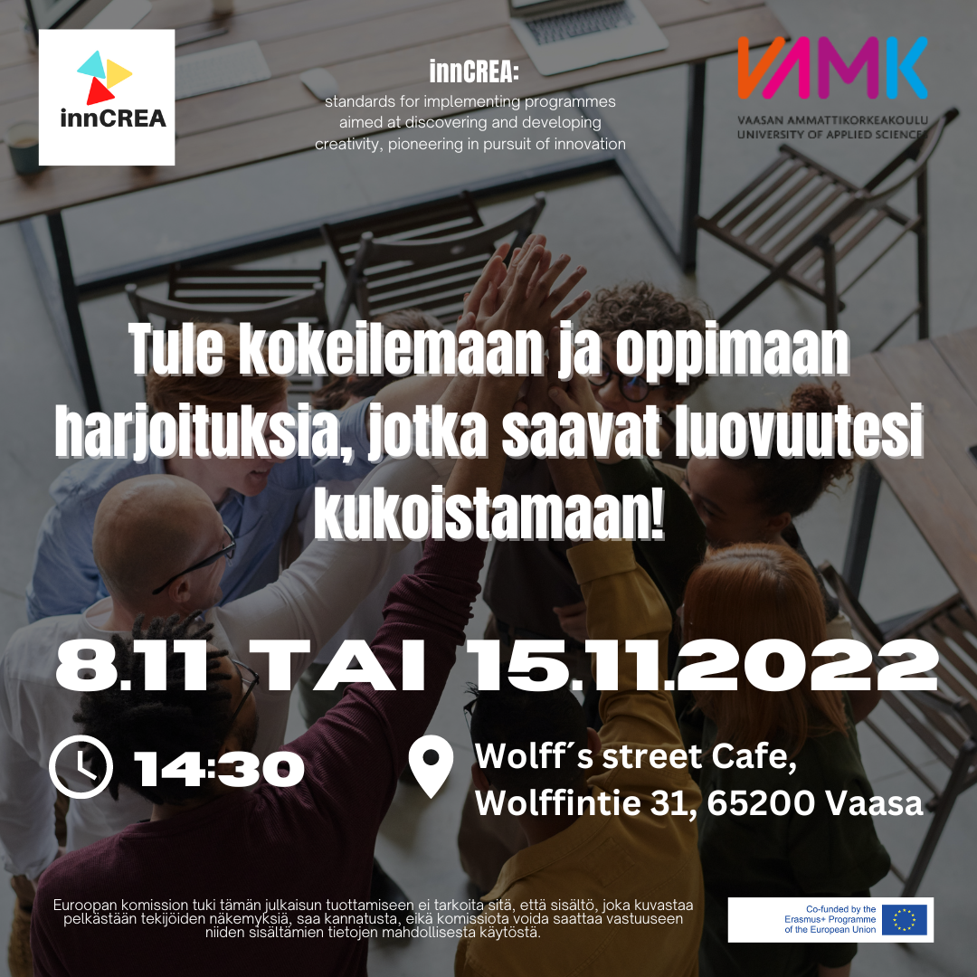Tule kokeilemaan innCREAn luovuustyökalua ja luovuusharjoitusta sekä kuulemaan lisää hankkeesta.