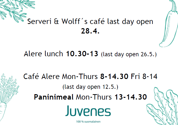 Juveneksen opiskelijaravintoloiden loppukevään aukioloajat