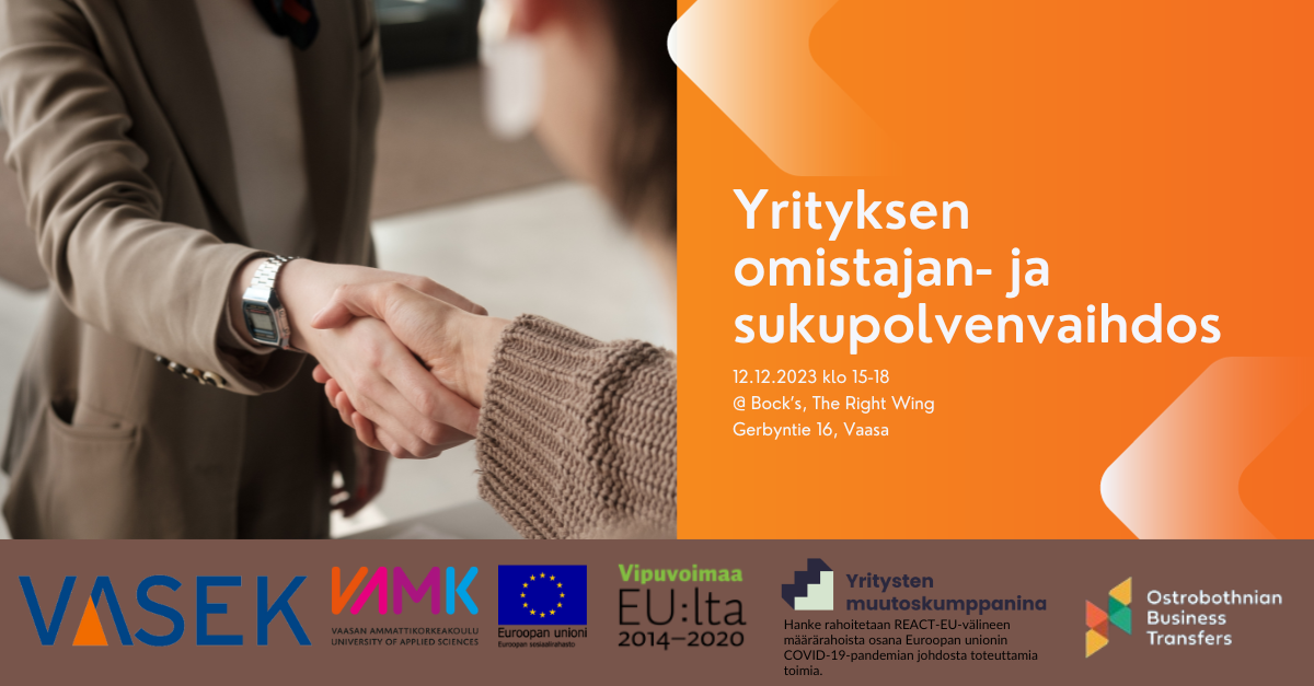 Vaasan ammattikorkeakoulun Myrsky-hanke sekä VASEKin Ostrobothnia Business Transfer -hankkeet ovat yhdistäneet voimansa, ja tarjoavat yrityksen omistajan- ja sukupolvenvaihdokseen koulutusta. Koulutuksessa puhumaan pääsevät VASEKin Antti Alasaari(Ostrobothnia Business Tranfer-hankkeen esittely, Asiaa sukupolvenvaihdoksesta), Finnveran aluepäällikkö Päivi Kinnunen (Yrityskaupan rahoitus) sekä Dynamo Närpesin Stefan Malm ja Jakobstad Region Development Company Concordian Kari Myllymäki (Yritys myyntikuntoon). Lisäksi tilaisuudessa keskustellaan yrittäjän arjesta suositun puhujan Tomi Kaukisen johdattamana.