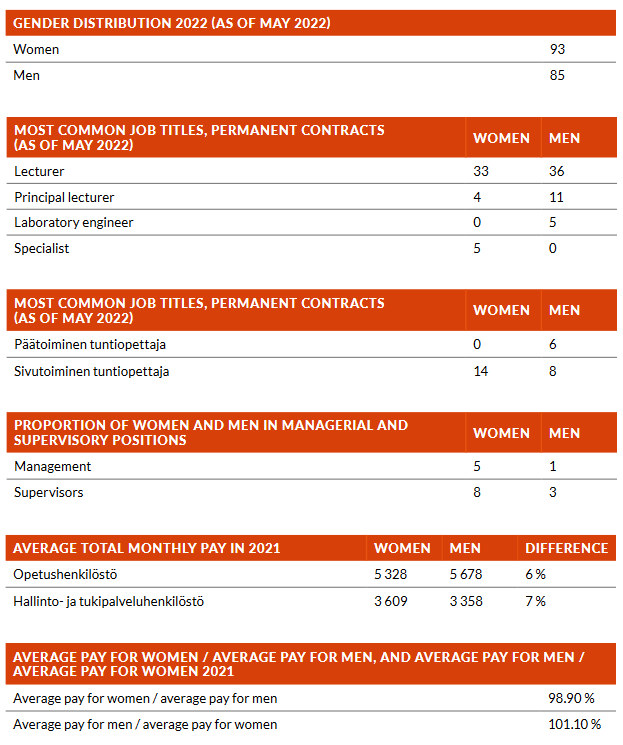 Vaasa University of Applied Sciences has an almost equal number of men and women among its staff. Men and women work in a variety of jobs, regardless of gender. We try to avoid gender-specific language in our recruitment and promote the placement of our staff in different roles, regardless of gender. Pay is not dependent on gender. Our working conditions are suitable for everyone, and we try to prevent gender discrimination by means such as using the Ethical Code of Conduct in our daily activities. Vaasa University of Applied Sciences takes the above into account especially in recruitment, hiring and employment, but also in all day-to-day activities in accordance with the Ethical Code of Conduct.