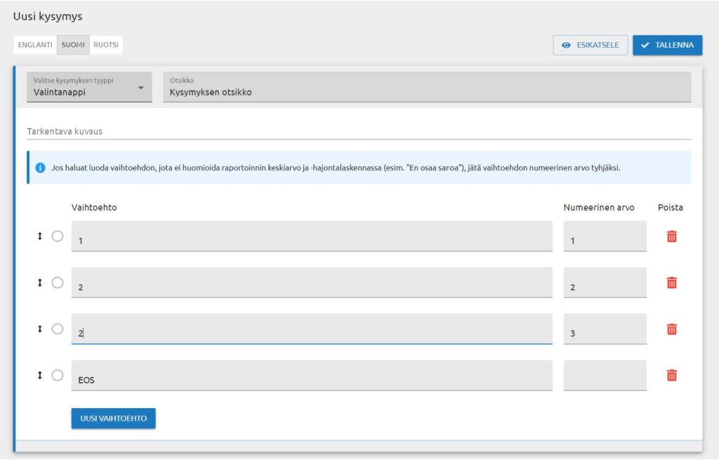 Valintanappi -tyyppisissä kysymyksissä on mahdollista lisätä ns. EOS-vastausvaihtoehto jättämällä vastausvaihtoehdon numeeminen arvo tyhjäksi. Tällöin näitä vastausvaihtoehtoja ei huomioida laskettaessa vastauksen keskiarvoa tai hajontaa.