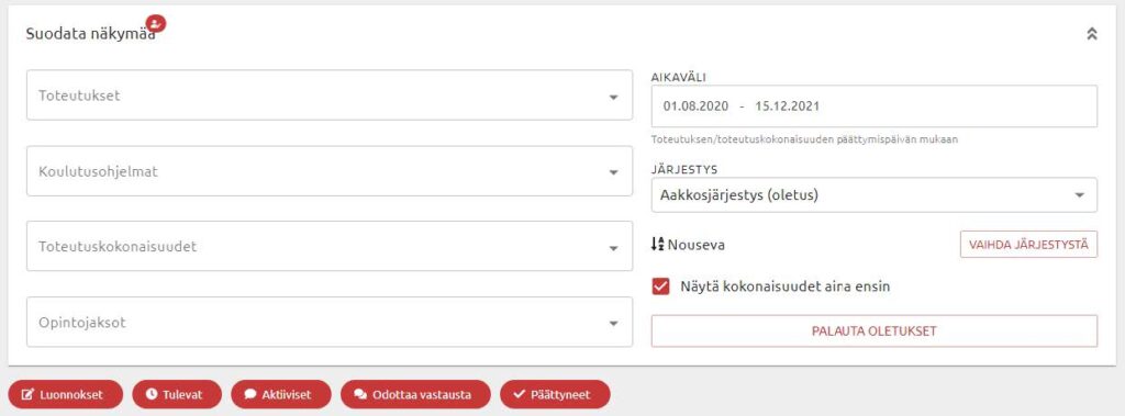 Voit myös suodattaa näkymää toteutuksien, koulutusohjelmien, opintojakson tai aikavälin perusteella. Lisäksi voit muuttaa listan järjestystä.