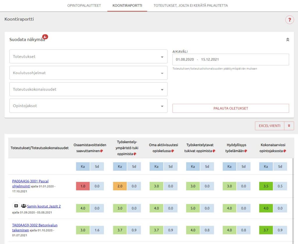 Tällä välilehdellä sinun on mahdollista tarkastella päättyneiden kyselyiden vastauksia kootusti. Näet yhteisten kysymysten keskiarvot ja hajonnat päättyneiden toteutusten osalta. Mahdollisen värikoodauksen selitteen näet otsikkorivin väripaletti -kuvakkeesta. Lisäksi näet vastaajamäärät sekä vastausprosentin. Taulukon loppuun on koottu myös kaikki vastausten keskiarvot kysymyksittäin omien toteutusten ja yhteistoteutusten (toteutuksella oli myös muita opettajia) osalta. Saat tähän liittyen vielä kattavammat tiedot Excel tiedostoon, jossa tuloksia voi tarkastella kaikkien toteutuksella esitettyjen kysymysten osalta. Myös koontiraporttia on mahdollista suodattaa toteutuksien, koulutusohjelmien, opintojakson tai aikavälin perusteella.