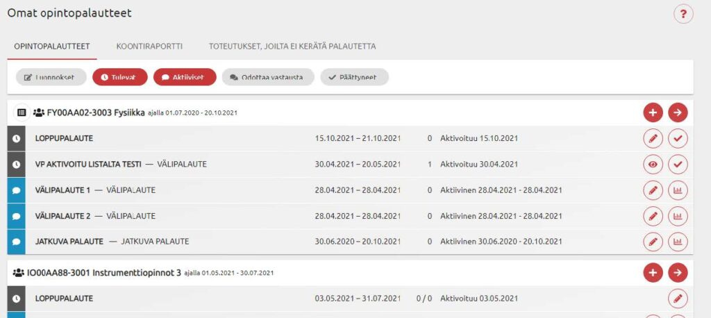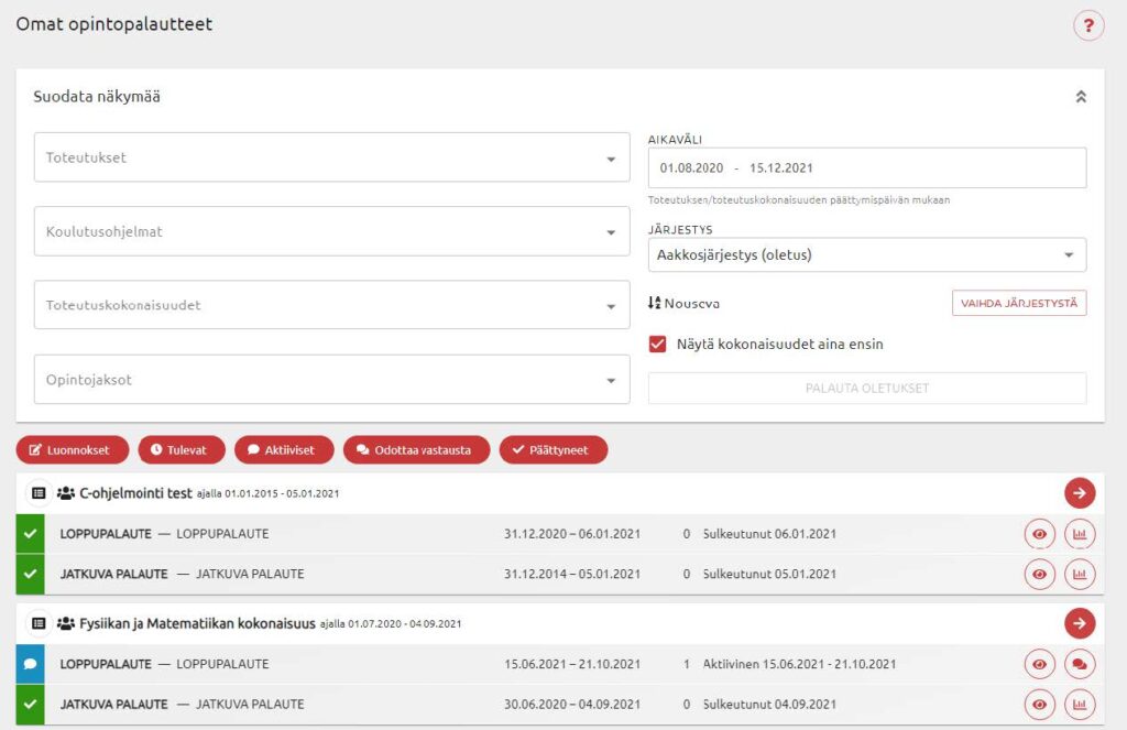 Etusivun koosteessa näkyy kunkin opintojakson rivillä palautelomakkeen tila värillisenä ikonina vasemmassa laidassa. Palautelomake voi olla joko tuleva, aktiivinen, vastausta odottava tai päättynyt.