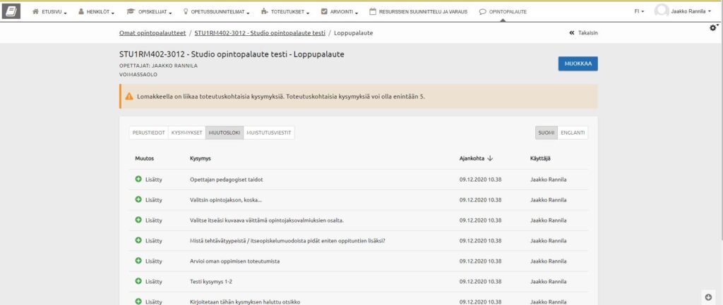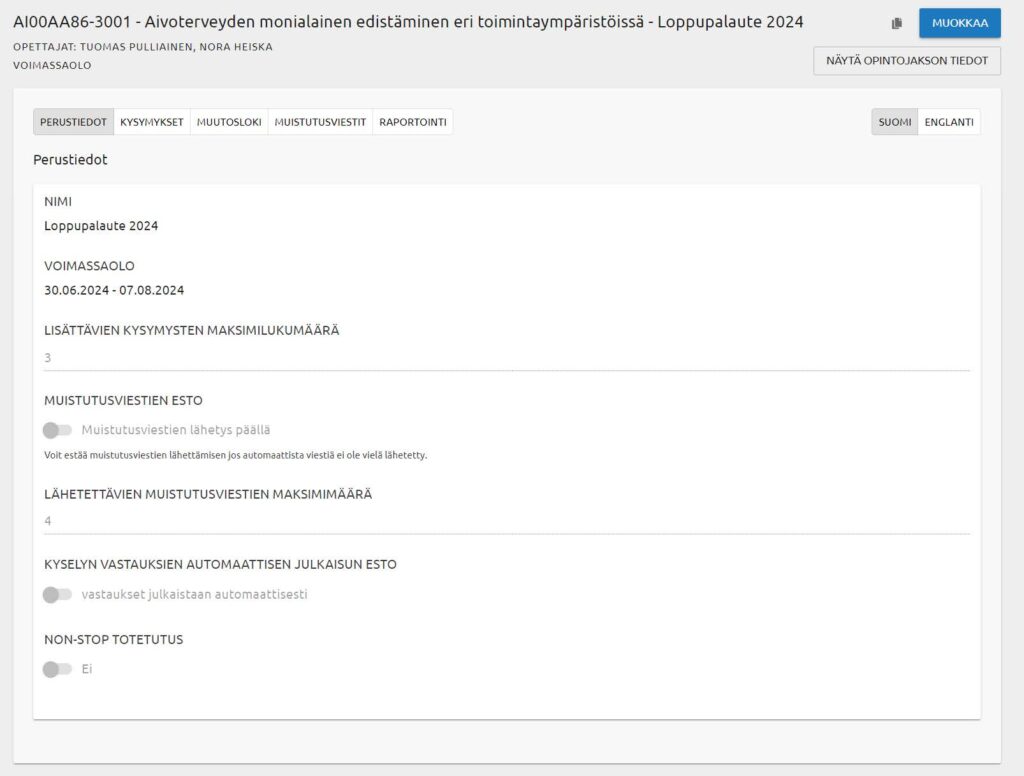 Kun avaat valitun palautelomakkeen kynä-ikonista eli muokataksesi kyselyä, näet avautuvan sivun ylälaidassa toteutuksen nimen ja koodin, opettajien nimet ja palautelomakkeen tyypin (esim. Loppupalaute).