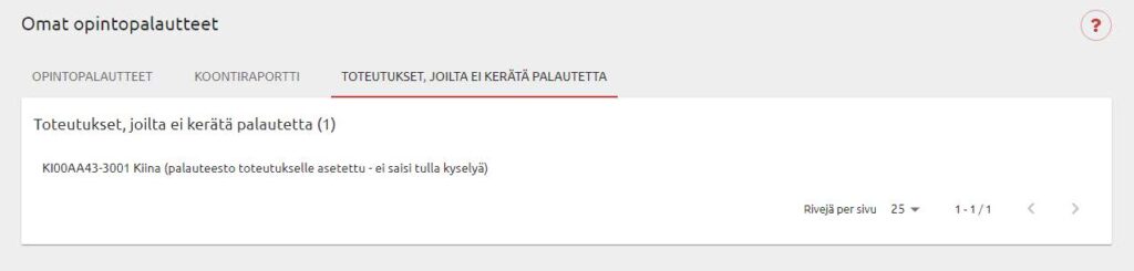 Jos joltakin toteutukseltasi /-kokonaisuudeltasi ei kerätä palautetta, näet Toteutukset, joilta ei kerätä palautetta -välilehdellä toteutuksen nimen ja koodin. Pääkäyttäjä ja koulutusohjelmajohtajat ylläpitävät listaa opintojaksoista ja toteutuksista, joista ei kerätä palautetta.