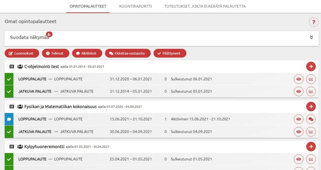 - Päättyneet: vastaus palautteeseen annettu, tai sen julkaisun määräaika on päättynyt