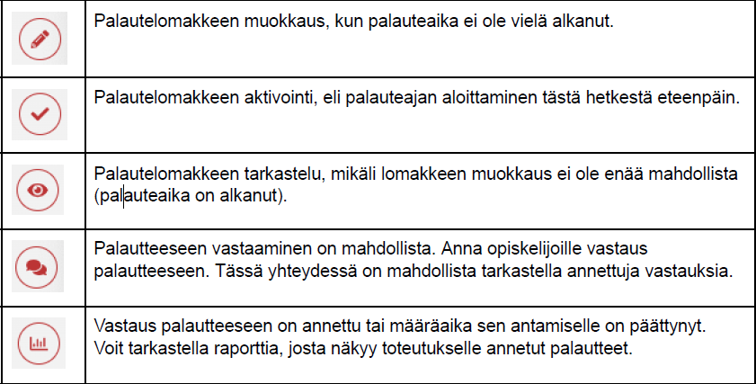 kuva 6 Palautelomakkeen ikonit ja selitykset