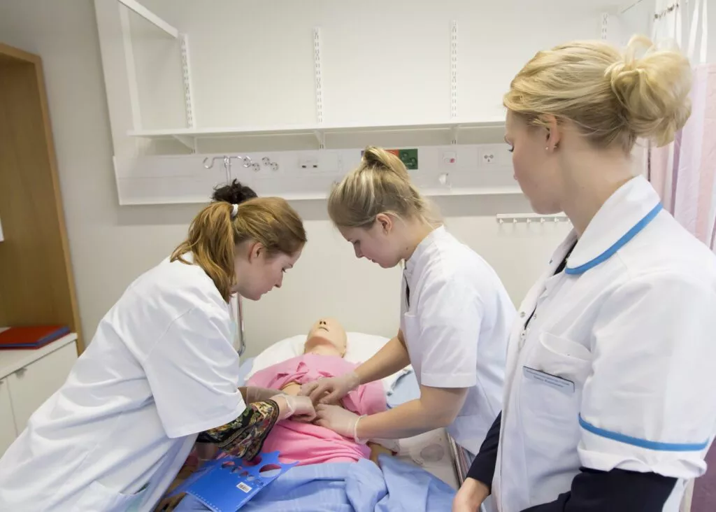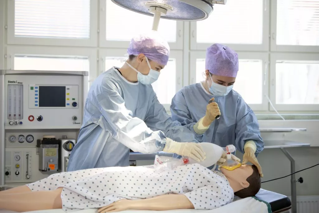 Harjoitusluokissa voi simuloida aitoja hoitotilanteita ja pohtia käytännön haasteita. Simulaatio-opetus aloitetaan heti ensimmäisenä opiskeluvuonna ja ajan myötä siirrytään yhä vaativampiin toimenpiteisiin.