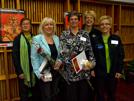 Oppilaitokset palkitsivat tapahtumassa ansioituneita aikuisopiskelijoitaan ja muistuttivat, että jokainen aikuisena opiskeleva on kunniamaininnan arvoinen. Kuvassa vasemmalta Vamkin Sinikka Hangasmäki, palkitut aikuisopiskelijat Iiris Aalto (oikeushallinto) ja Marjo Grönfors (sähkötekniikka) sekä Merja Salomäki-Jurkka ja Kristiina Pulakka Vamkista.
