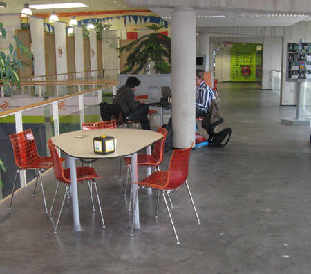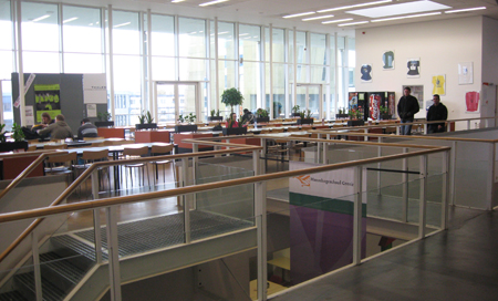 Hanze Universityn moderneja käytävätiloja, joissa opiskelijoilla oli mahdollisuudet tehdä töitä kannettavilla tietokoneilla.