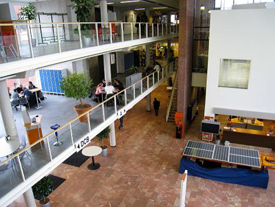 Hanze Universityn viihtyisä aula, jossa esillä opiskelijaprojektin tuloksena syntynyt kilpailuvoittaja - aurinkopanelivene.