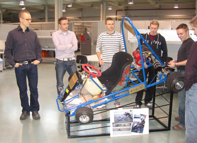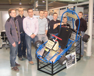 Ohjaavan opettajan mukaan työkalut piti välillä piilottaa, jotta innokkaat opiskelijat saatiin laboratoriosta kotiin. Projektissa mukana olleet koneosaston opiskelijat vasemmalta: Juha Kananoja, Timo Kortet, Jani Leppämäki, Ari-Matti Ojanperä, Markus Keskitalo, Esa Ylivainio, Sami Lehtonen ja Pasi Lehtonen. Kuvasta puuttuvat Jani Ekola, Jukka Kantoniemi ja Sami Koivisto.