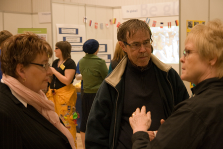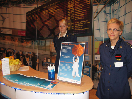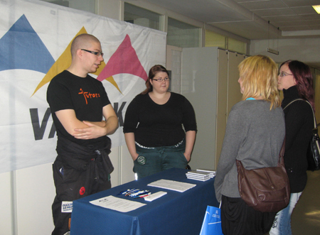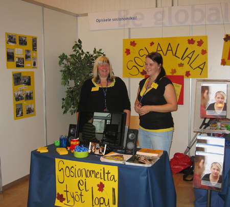 Vamkin global-henkisellä messuosastolla insinööri-opiskelija Annika Paakki sekä avoimen ammattikorkeakoulun suunnittelija Kristiina Pulakka.