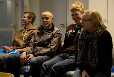 Perholaiset Mikael Viitala, Heikki Riihimäki, Eetu Erkkilä ja Leea Linna katselemassa Vamk-esittelyvideoita.