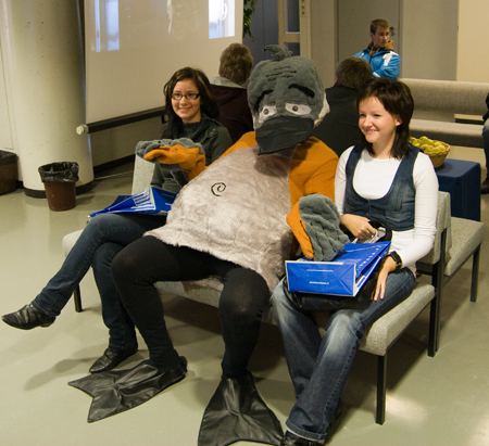 Vamkin maskotti kanadanhanhi Bertil hauskuutti mm. Kuortaneen lukion Satu Kivirantaa ja Sofia Isoketoa.
