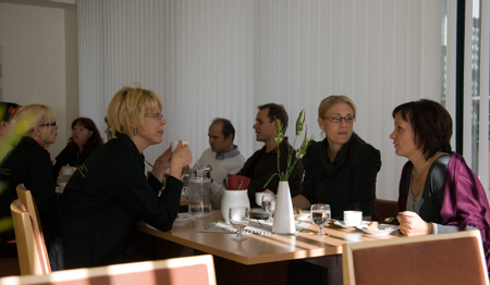Opokahvilassa opinto-ohjaajat pääsivät tapaamaan kollegoitaan ja päivittämään koulutus- ja hakutietoja. Kurikan ja Ylistaron lukioiden opot Heli Stenius ja Maarit Pouttu-Alanko suunnittelemassa kauden jatkoinfoja Vamkin oppilaitoskoordinaattori Merja Salomäki-Jurkan kanssa. Taustalla Vamk-opo Riitta Aikkola päivittämässä kuulumiset Peräseinäjoen ja Kristiinankaupungin opojen Eero Klemolan ja Timo Rajamäen kanssa.