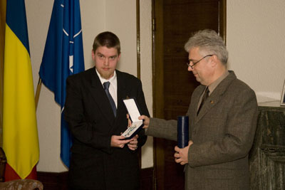 Romanian Suomen suurlähettiläs Lucian Fätu luovutti ritariristin Antti Ruokoselle (vasemmalla) 12.1.2008 Romanian Suomen suurlähetystössä.