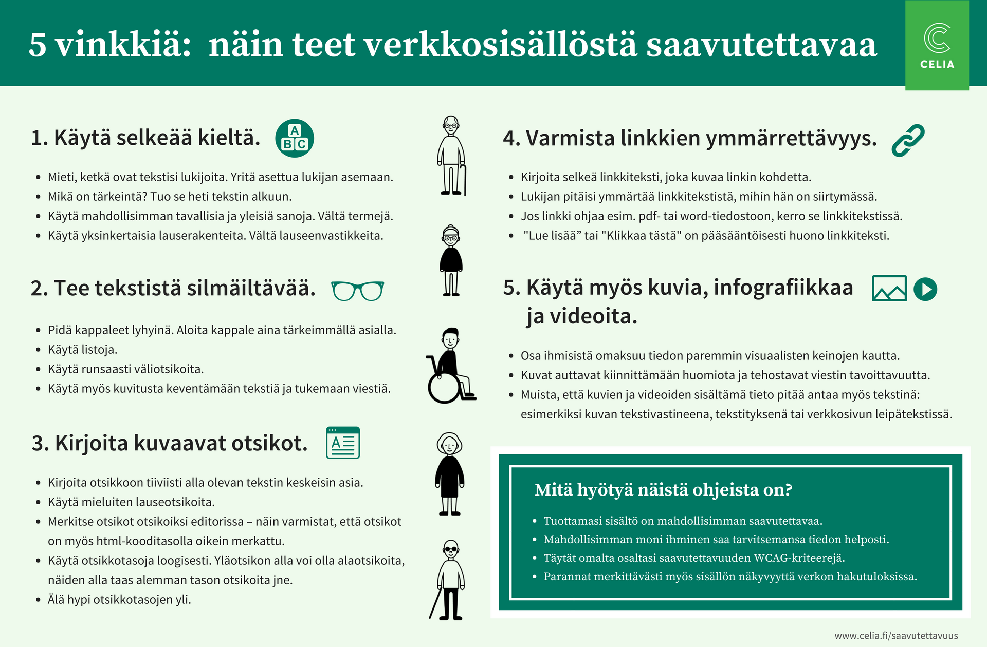 Bonus: Kuvassa saavutettavuusasiantuntijan Celian lisävinkit selkeään verkkosisältöön. (klikkaa suuremmaksi)