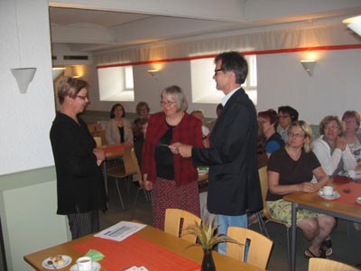 Opetusjohtaja Raijaliisa Laakkonen ojensi lahjakortin tunnustukseksi hienosta tuloksesta. Palkintoa vastaanottamassa osastonjohtajat Regina Nurmi ja Raimo Koivisto.