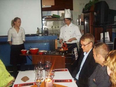 Tuli-teema näkyi onnistuneesti kattauksessa, menussa sekä jälkiruuan liekityksessä.