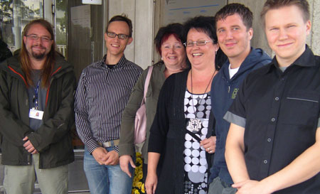 Vaasan ammattikorkeakoulun opettajat Mika Tamminen ja Riku Niemistö (vasemmalla) ohjasivat Eroretki-hanketta. Työtä toteuttivat mm. sosionomiksi opiskelevat Virpi Tolonen ja Sirpa Koivula sekä tradenomiopiskelijat Rami Louke ja Juha Rintala.