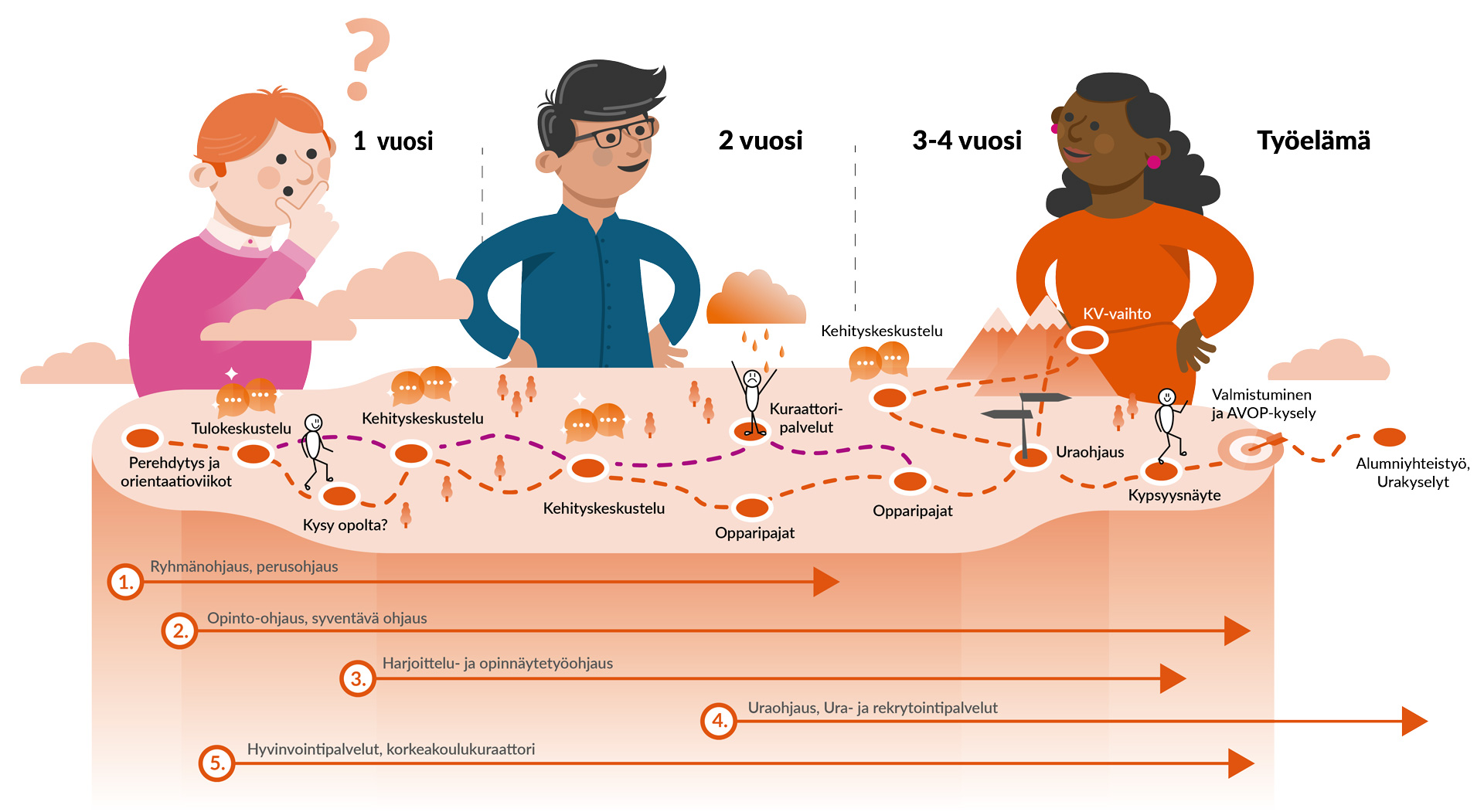 Tarjoamme monipuolista tukea opintojen suunnitteluun ja sujuvaan etenemiseen. Käytössämme on opiskelijakeskeinen ohjausmalli, joka koostuu: