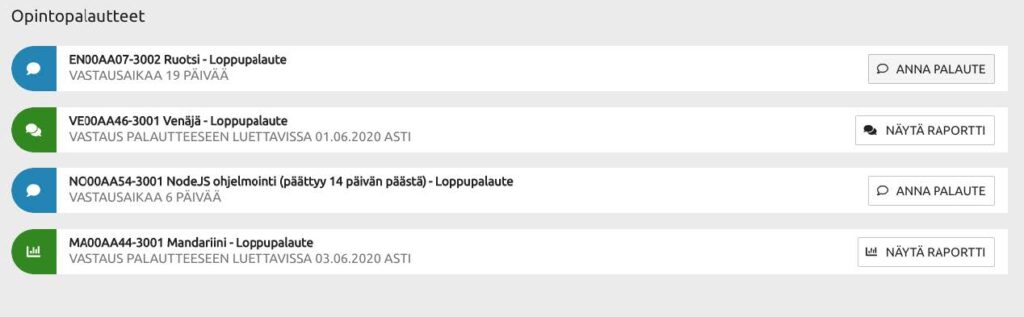 Näet Sparkin etusivulla koosteen niistä opintojaksoista, joille ilmoittautumisesi on hyväksytty ja voimassa, ja joissa on joku aktiivinen palautekysely. Jokaisella rivillä näet ko. opintojakson nimen ja koodin, sekä palautelomakkeen nimen ja tyypin (esim. Loppupalaute tai välipalaute).