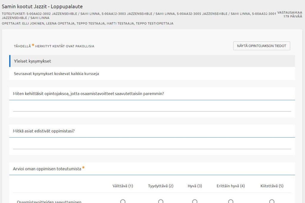 - mikäli kyse on loppupalautekyselystä, et näe muiden opiskelijoiden vastauskoostetta,