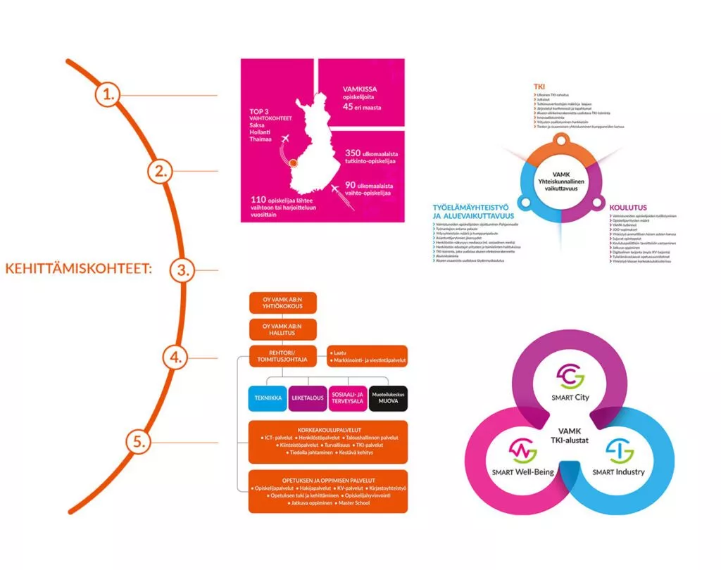 VAMKin graafinen ohjeisto on käytännön opas brändinmukaiseen viestimiseen. Ohjeistosta löydät tietoa logon ja värien käytöstä, typografiasta, kuvastosta ja graafisista elementeistä.