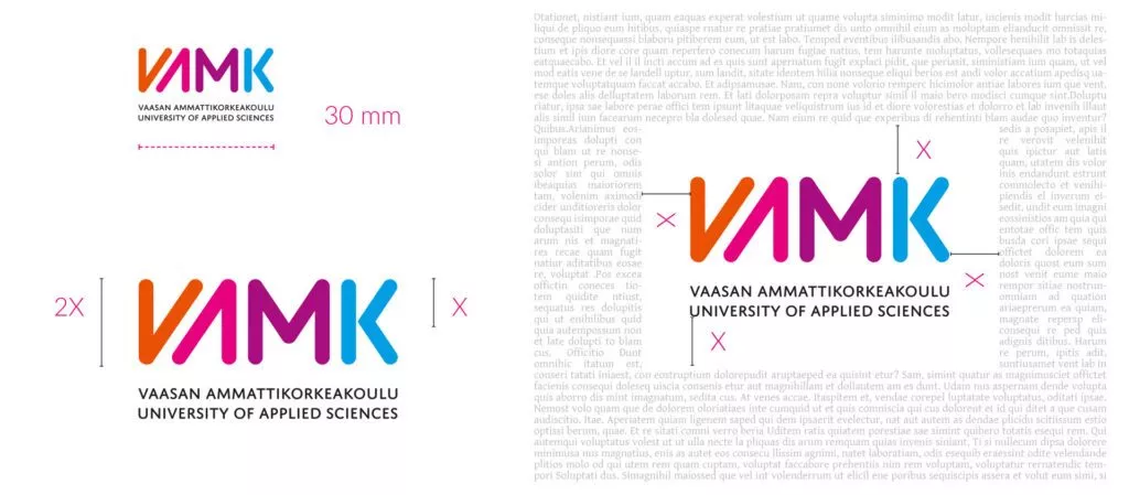 Logon muotoa, asettelua, osia, suoja-alueita tai väriä ei saa muuttaa. Logon tekstiä ei saa irroittaa VAMK-symbolista, kuin korkeakoulun markkinointi- ja viestintäpalveluiden toimesta. Logon suoja-alueelle tai logon päälle ei saa sijoittaa grafiikkaa tai kuvia. Logosta ei saa tehdä omia versioita. Logon tulee erottua taustasta. Logon alla oleva väripinta ei saa koskaan olla saman sävyinen kuin VAMK-tekstin väritys.