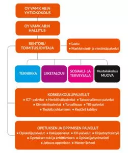 Vuoden 2019 lopussa VAMKissa työskenteli 160 henkilöä, henkilötyövuosina mitattuna 155, mutta vuosille 2020-2021 jo osin toteutuneet rekrytoinnit tulevat näkymään henkilömäärien ja –työvuosien kasvuna. VAMKin organisaation on kuvattu kuvassa 1.
