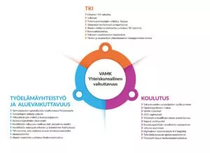 Pohjanmaan liitto, Pohjanmaan ELY-keskus ja Pohjanmaan TE-toimisto ovat keskeisiä yhteistyökumppaneitamme ennakoidessamme alueen elinvoimaa edistävää osaamistarvetta. Aktiivinen työelämäkumppanuus todentuu monilla tasoilla. VAMK on solminut yhteistyösopimuksen kymmenen alueen keskeisen työelämäkumppanin kanssa. Vuosittain kutsumme sekä opettajamme että yhteistyökumppanimme dialogisiin, yhteiskehittämiseen perustuviin tapaamisiin ja työpajoihin. Sopimuksiin on kirjattu yhteistyöalueet ja molempien osapuolten yhteyshenkilöt. Tämä yhteistyö nivoo TKI-työn, työelämän toimeksiannot ja opinnäytetöiden aiheet työelämästä nouseviin kehittämistarpeisiin ja auttaa meitä hyödyntämään uusinta työelämältä saatavissa olevaa tietoa opetussisältöjen suunnittelussa. Tällä toimintamallilla haluamme integroida TKI-toiminnan entistä kiinteämmin osaksi opetusta ja saada lisää tekijöitä ja volyymiä TKI-toimintaan. Joillakin aloilla neuvottelukunnat ovat aktiivisesti mukana tuomassa työelämän näkemyksen koulutuksen suunnitteluun. Työn muutoksissa jatkuvan oppimisen merkitys kasvaa entisestään. Tähän vaateeseen olemme varautuneet rekrytoimalla uutta henkilöstöä jatkuvaan oppimiseen. Tavoitteenamme on lisätä omaa ja yhteistyössä eri toimijoiden kanssa tuotettua kaikille avointa koulutustarjontaa.