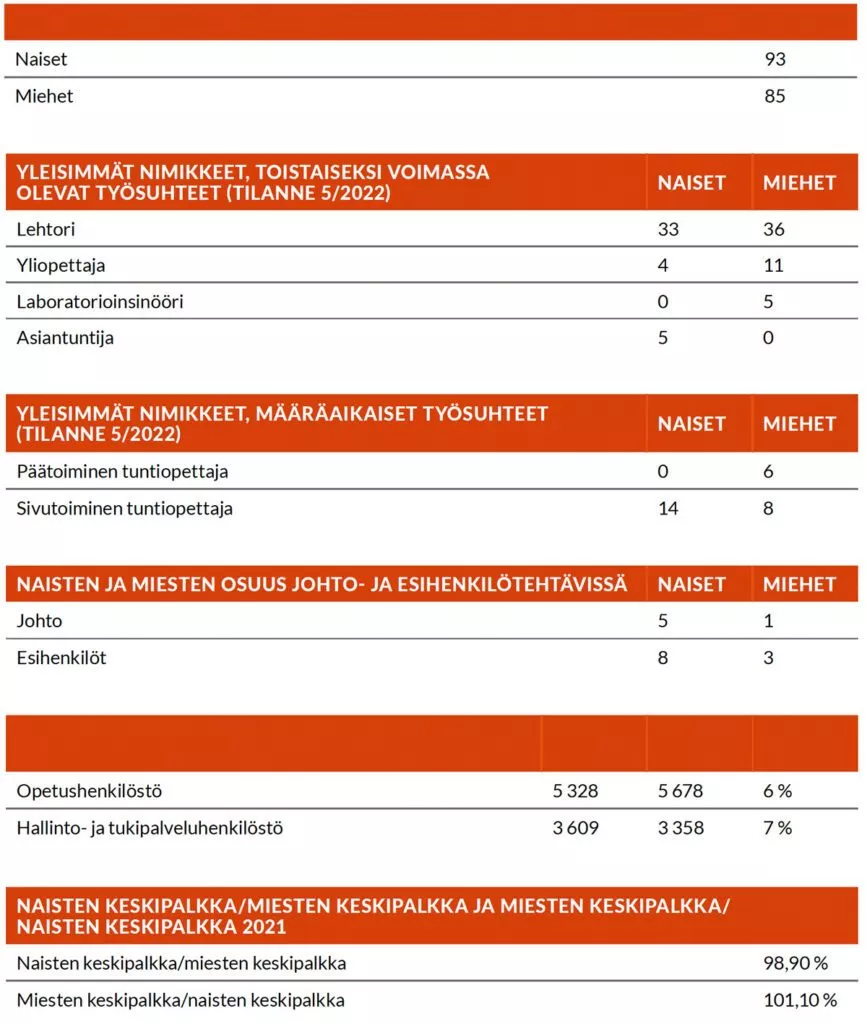 Vaasan ammattikorkeakoulun henkilöstöstä miehiä ja naisia on lähes saman verran. Miehiä ja naisia työskentelee eri tehtävissä sukupuolesta riippumatta. Pyrimme rekrytoinneissa välttämään sukupuolittuneita ilmaisuja ja edistämme henkilöstömme sijoittumista eri tehtäviin sukupuolesta riippumatta. Palkkaus ei ole sukupuolesta riippuvaista. Työolot sopivat kaikille ja pyrimme ennakoimaan sukupuoleen perustuvaa syrjintää esimerkiksi eettisen toimintaohjeiston käytöllä arjessa. Vaasan ammattikorkeakoulu huomioi edeltävät seikat erityisesti rekrytoinnissa, palkkauksessa, työtehtävissä, mutta myös kaikessa arjen toiminnassa Eettisen toimintaohjeiston mukaisesti.