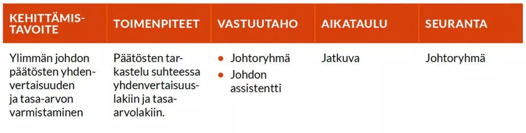 Työpaikan tasa-arvotilannetta arvioimme henkilöstökyselyillä vuosittain yhteistyössä eläkeyhtiön kanssa tehtävällä Työyhteisövirekyselyllä. Vuosittaisen työyhteisövirekyselyn lisäksi otamme vuonna 2024 käyttöön kvartaaleittain toteutettavan Työvire-kyselyn, jonka avulla pystymme seuraamaan henkilöstön työhyvinvoinnin tilaa entistä tiheämmällä syklillä. Lisäksi tilannetta seurataan pitämällä tilastoja naisten ja miesten sijoittumisesta eri tehtäviin sekä tekemällä kartoitus palkoista ja palkkaeroista.