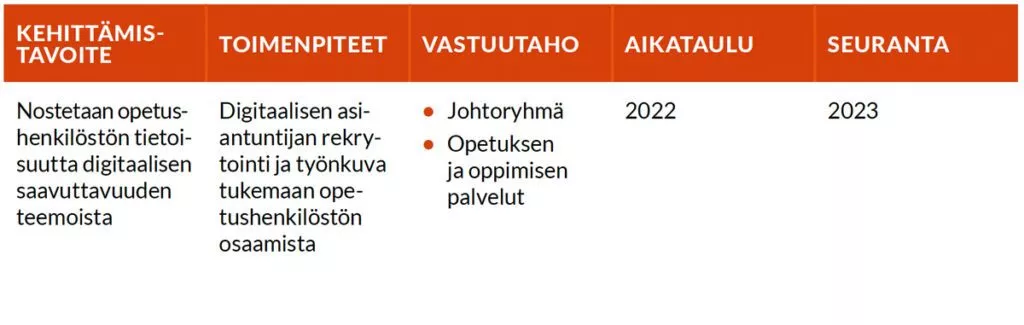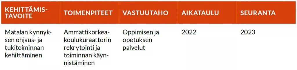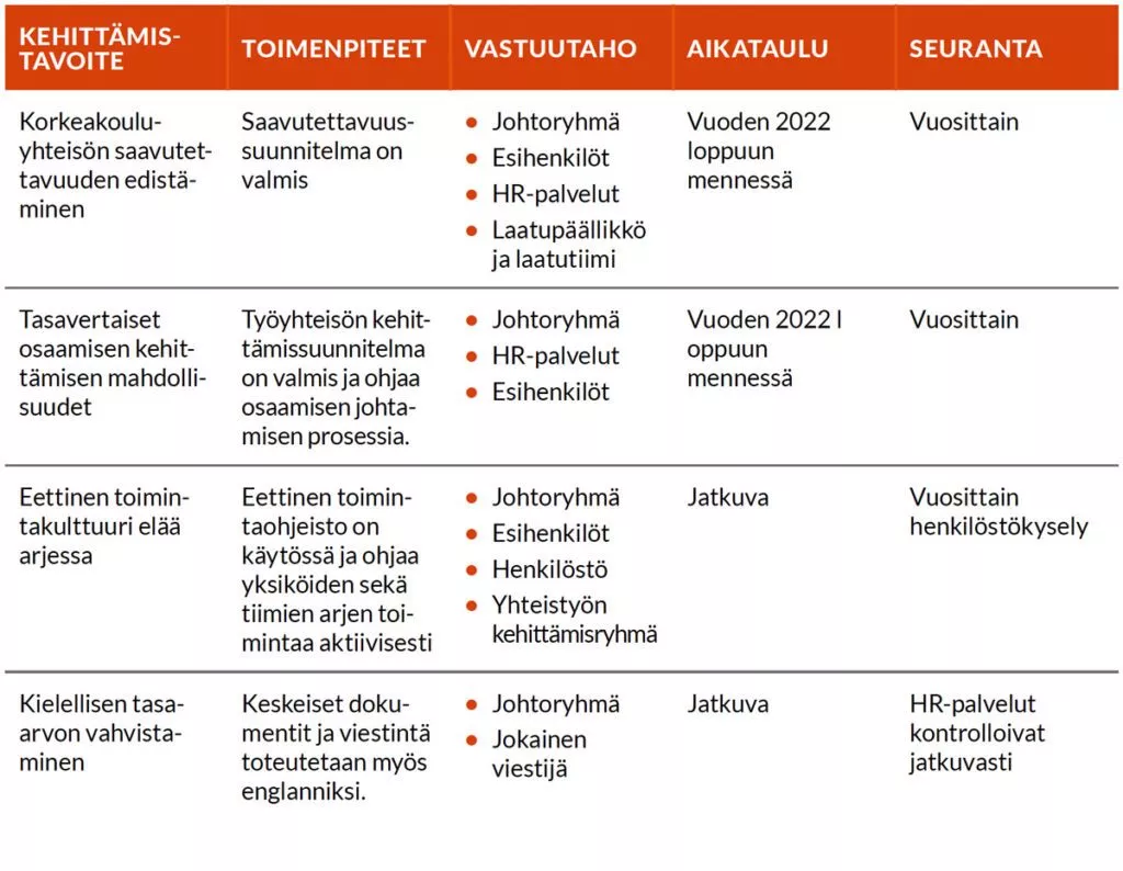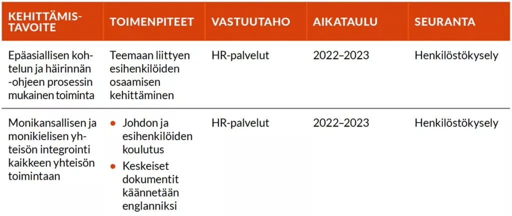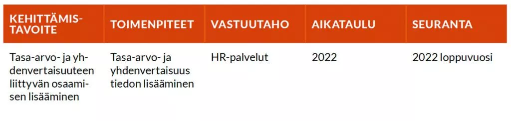 Vaasan ammattikorkeakoulun tasa-arvoa ja yhdenvertaisuutta edistävä suunnitelma kaudelle 2022-2023 sisälsi seuraavat kehittämistoimenpiteet: