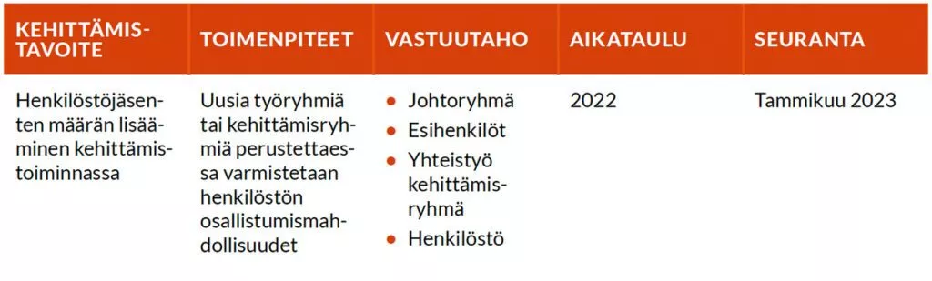 Vuosittain päivitettävä työyhteisön kehittämissuunnitelma toimii vuoropuhelun välineenä henkilöstön kanssa. Työyhteisön kehittämissuunnitelma sivuaa tasa-arvon ja yhdenvertaisuuden näkökulmia etenkin eri-ikäisten ja eri elämäntilanteissa olevien tarpeiden osalta.