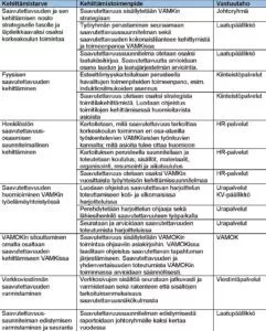 Saavutettavuussuunnitelmamme taustat, prosessi ja sisältö on käsitelty ja käyty läpi koko henkilöstömme kanssa yhdessä, syksyllä 2022. Kosusen suunnitelmassa mainituista 38 kehittämistavoitteesta valittiin tarkempaan tarkasteluun 22 kehittämistavoitetta, joiden osalta laadittiin nykytila-analyysi. Nykytila-analyysin osana hyödynnettiin mm. asiantuntijahaastatteluita VAMKin omien toimintojen osalta. Opiskelijakunta VAMOKin edustajat osallistuivat myös aktiivisesti prosessiin sekä haastatteluihin. Haastattelut ja haastatteluiden tulokset avasivat meille korkeakouluyhteisönä vahvuuksiamme sekä kehittämistarpeita. Tärkeimmiksi katsomamme kehittämistoimenpiteet löytyvät kootusti suunnitelman lopusta yhteenvetotaulukosta.
